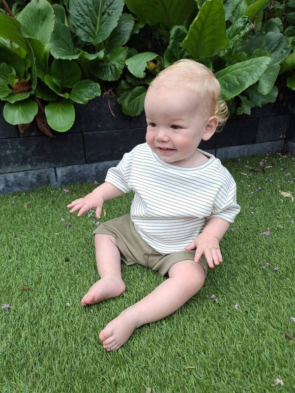 Setje van t-shirt en korte broek in een olijfgroen streepje