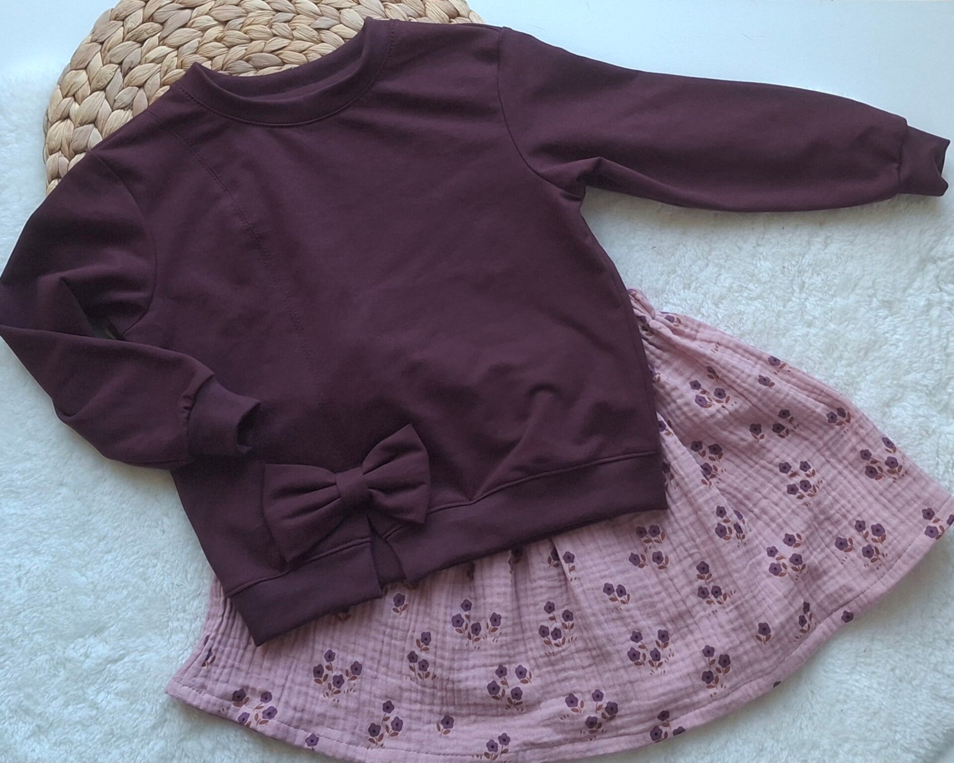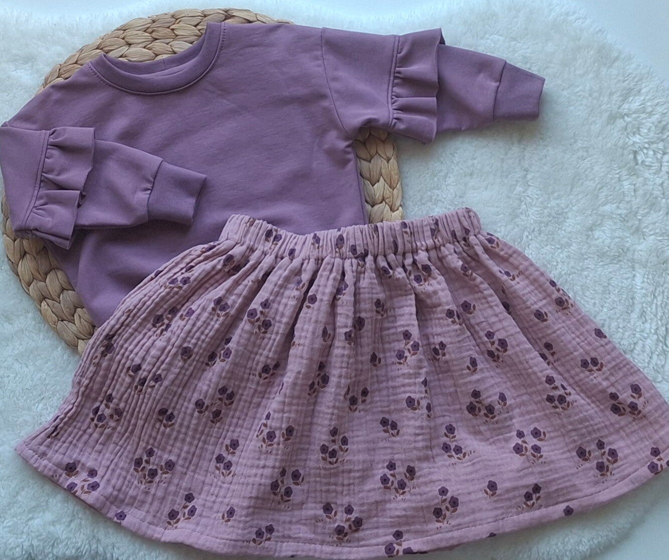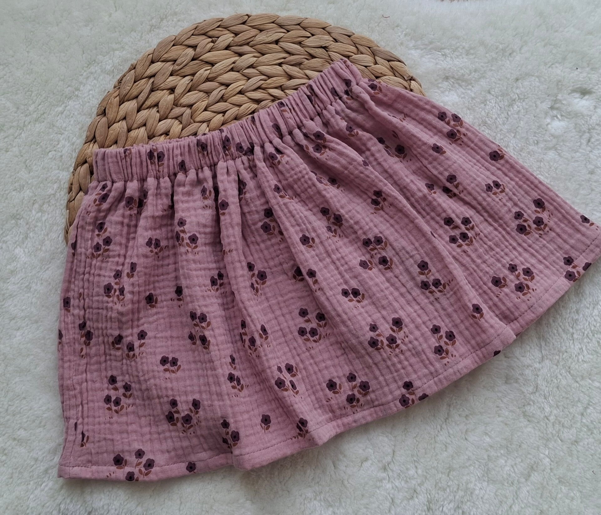 Een rokje van een mooie mauve kleur met bloemetjes wat ook heel mooi staat bij de aubergine en de paarse sweater
