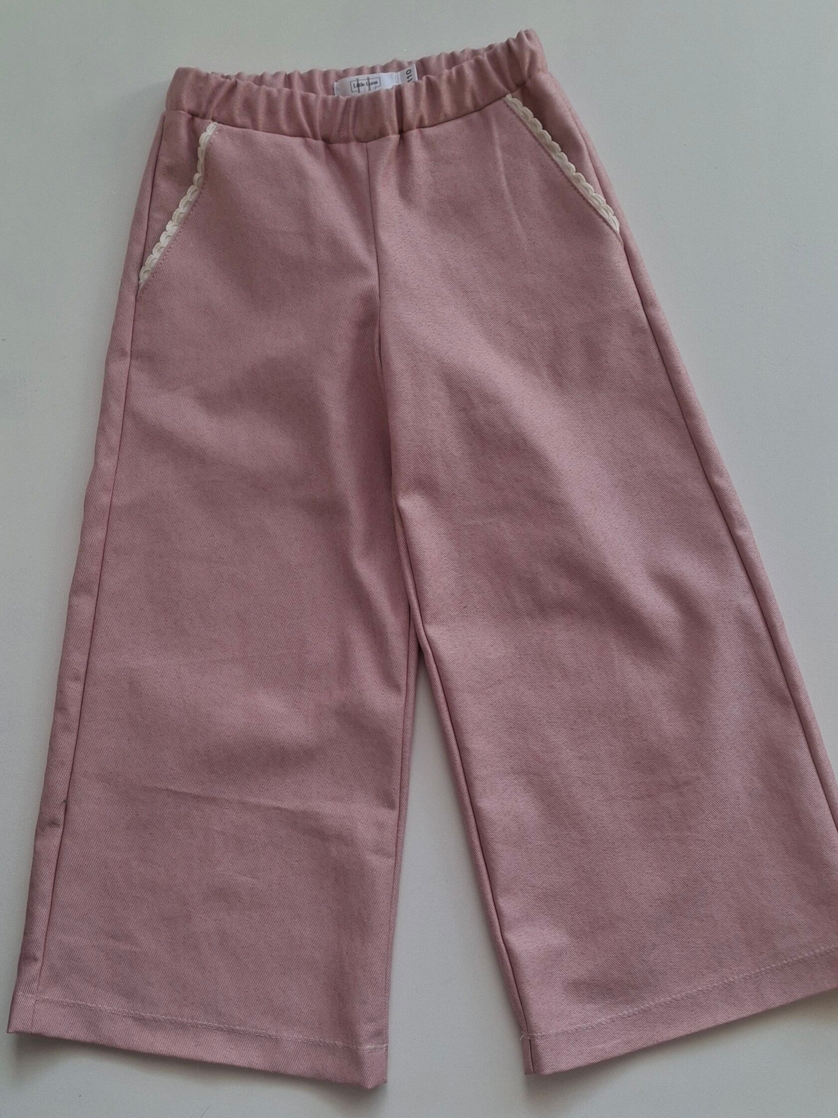 Een wijdleg broek in een roze stretchdenim! Een stoere wijde broek maar met de kantjes langs de zakken geven het een lief detail.